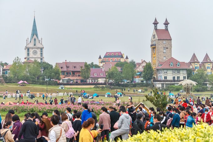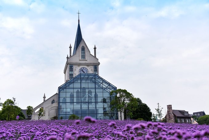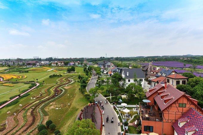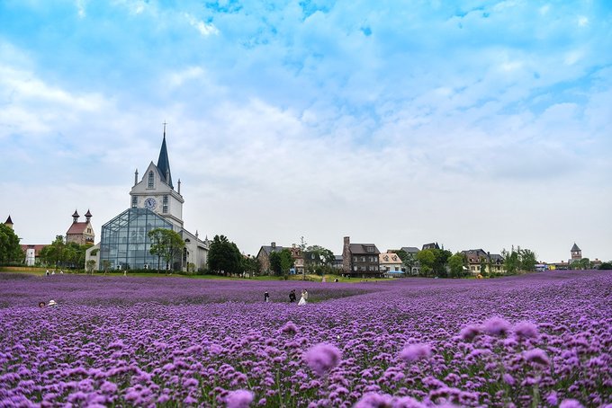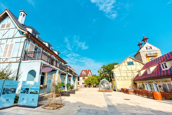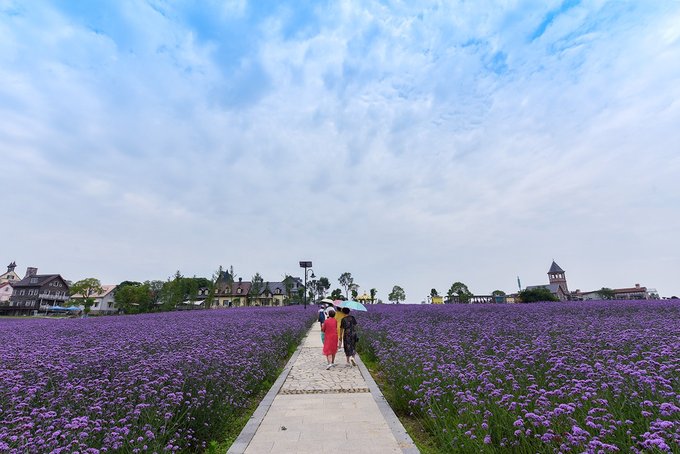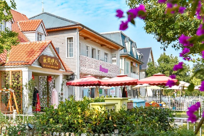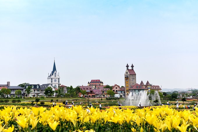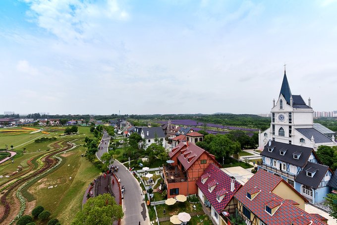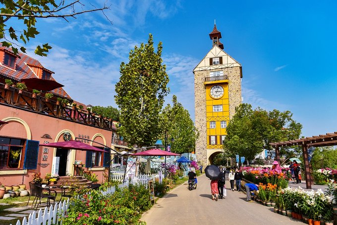 弗洛伊鲜花小镇处在花博汇的花海之间,穿过百合和醉蝶花看到的那排童话城堡就是了。这个小镇现在是武汉著名的网红打卡地,镇上有钟塔,有教堂,有各种各样的特色小店,西餐厅,邮局,蛋糕店,咖啡店,啤酒屋,手工艺品,民宿等等,一切热门元素这里都应有尽有。