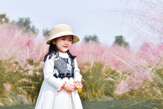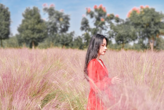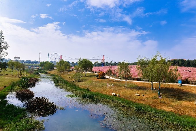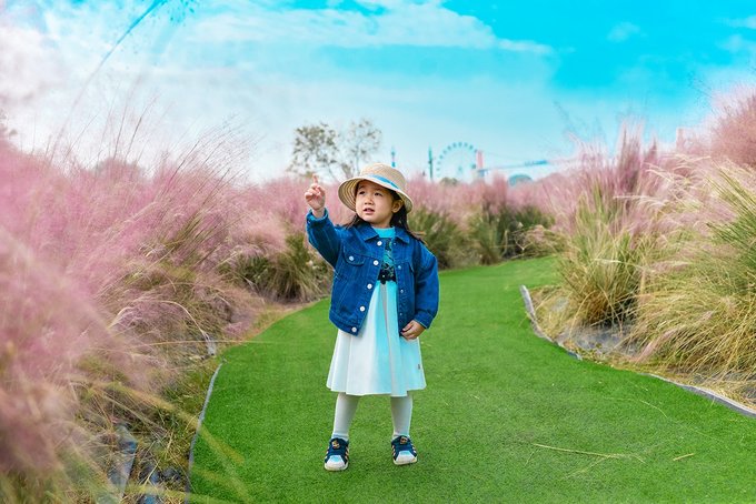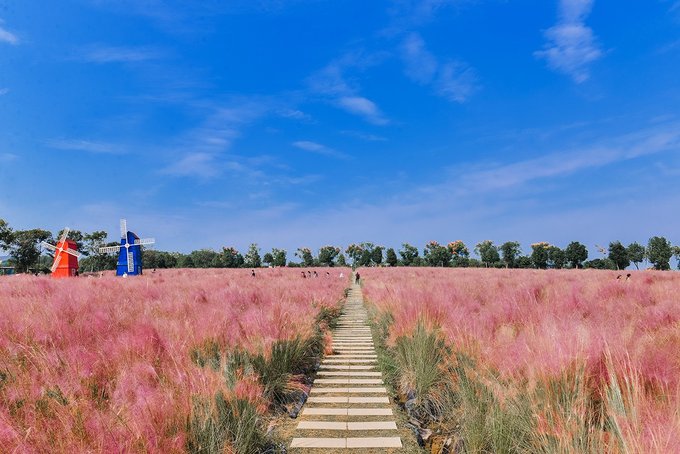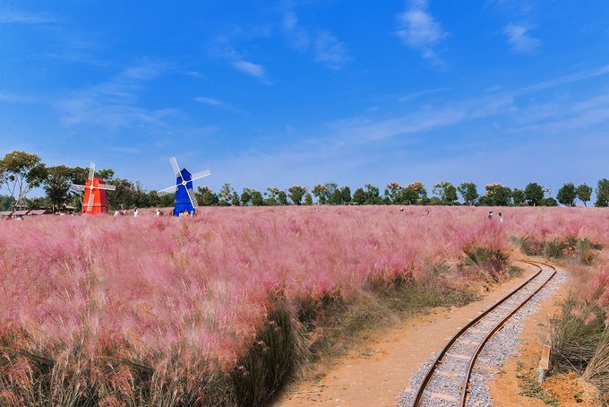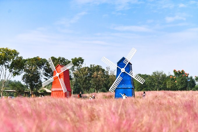 置身在浪漫的粉色花海里,微风轻轻吹过,粉黛子柔柔的在身边随风摇曳,远处有蓝天白云作伴,身后有风车轻摇,如梦似幻。
