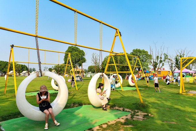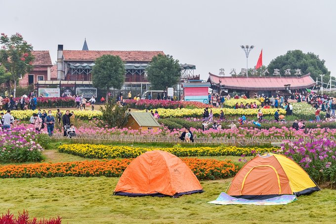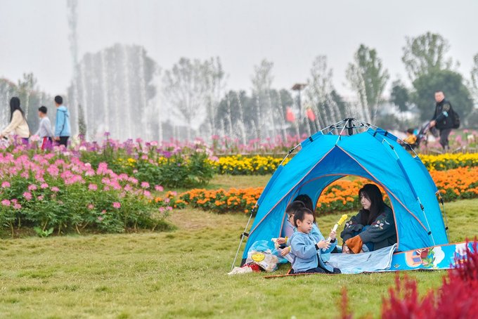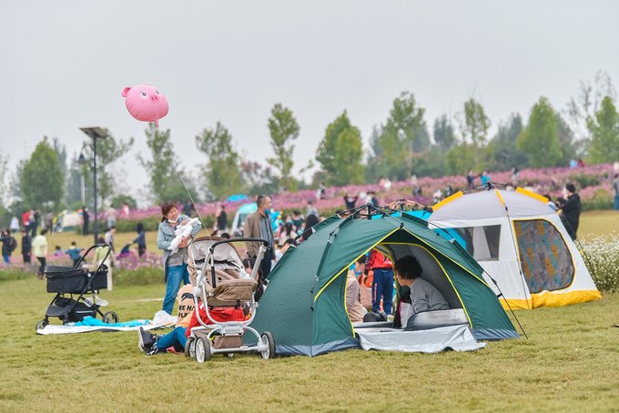 和花海融为一体的,还有大片的草坪空间。不少来游玩的旅客在草坪上扎帐篷,一家老小,齐乐融融。