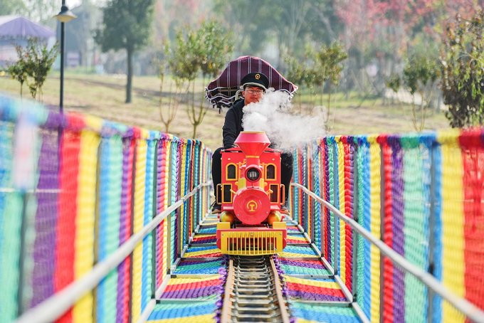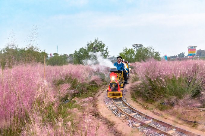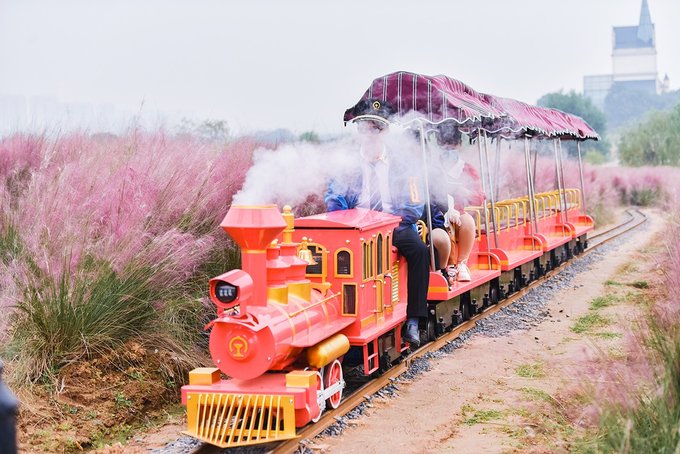 粉黛子花海里还设有各种网红打卡处,有“粉黛三千节”的主题字幕,有白纱帘缦的凉亭,还有穿越着花海中的蒸汽小火车。