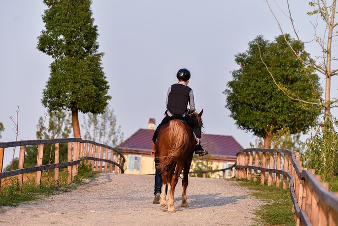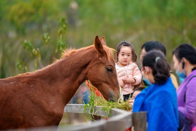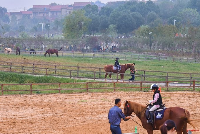 小姑娘不敢骑马,被爸爸抱着看马场里姑娘小伙驰骋,隔着栏杆喂喂马也觉得很嗨。