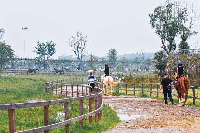 除了这些常规游乐项目,花博汇还有两大王牌,一个是能坐着在天上绕花博汇飞一圈的直升机,还有一个是马场。