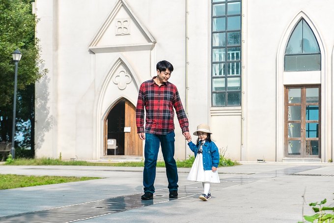 小姑娘很喜欢教堂门前的石板路,雀跃的拉着我的手,一遍遍走过来走过去。