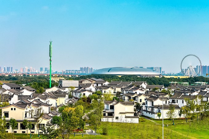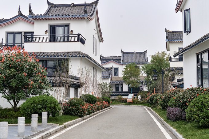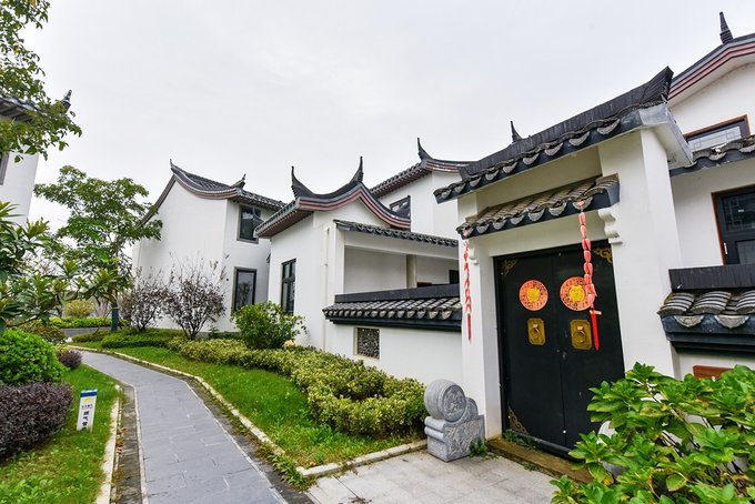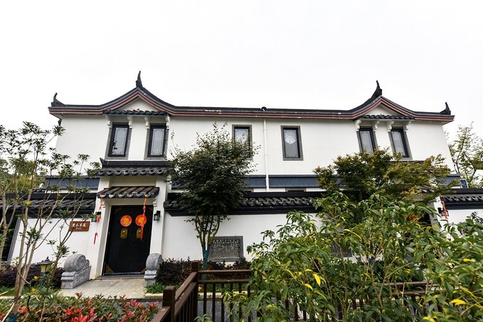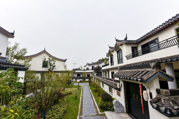 问茶村则是一水的徽派建筑风格,白墙青瓦,斗拱飞檐,房前有庭院,屋后有小花园,间或点缀着石桌石凳,雕花亭阁,质朴高雅,淡然潇洒。