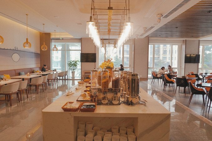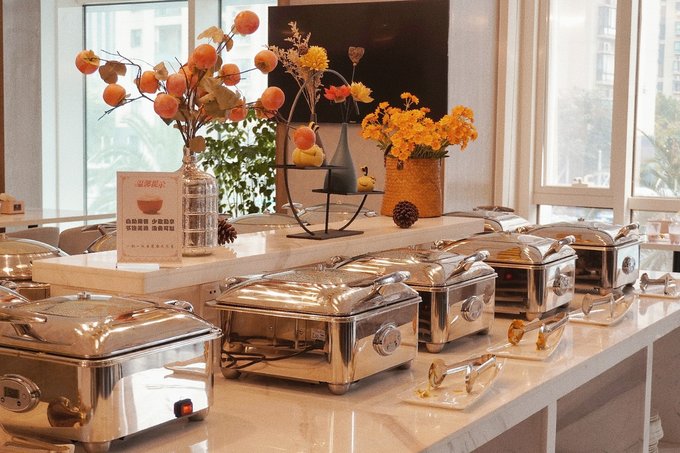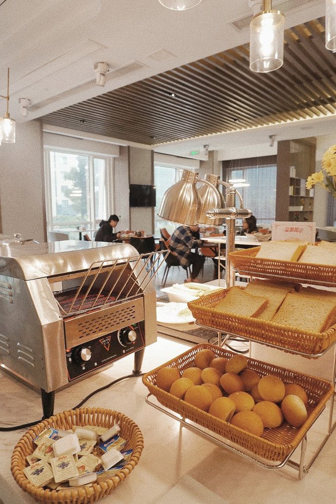 二楼有健身房和餐厅。餐厅会为所有住客提供免费早餐和下午茶,一站式吃住体验。早餐虽然是自助的形式,但餐厅入口处还有一个料理台,如果你想吃面条或者馄饨,厨师都能变着戏法似的端给你。环境干净卫生,连我这个处女座都挑不出一点毛病来。自助台上的食物琳琅满目,无论是中式早餐爱好者还是西式早餐追捧者,都能在这里吃撑自己的胃。