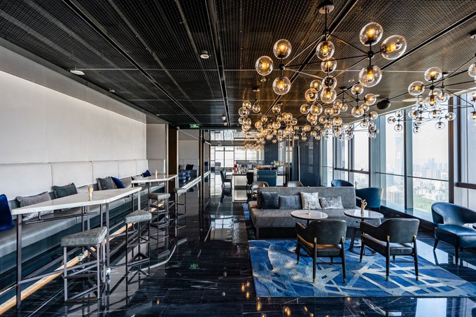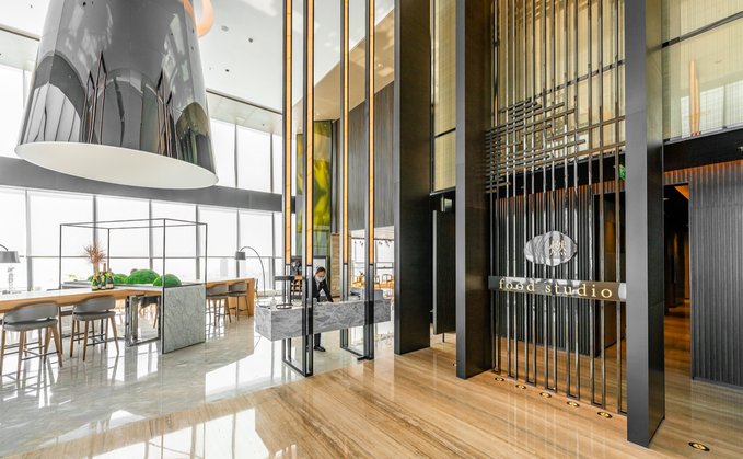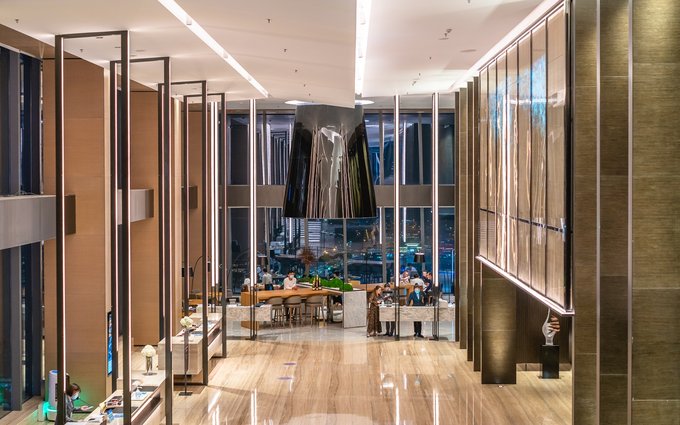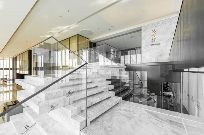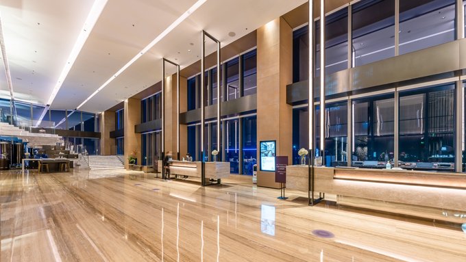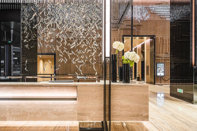 位于酒店57楼的大堂,以全景落地玻璃窗为设计,深圳湾山海之景一览无遗,日出日落尽是鹏城美景。深圳湾万丽酒店独具高处,仿佛成为这座城市的一片与众不同的绿洲。土壤色的大理石更与“土”元素的设计理念相吻合,就像充满生机的大地孕育出无限的奇迹。