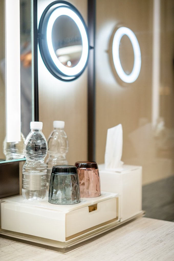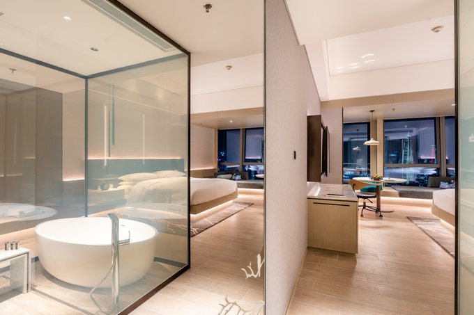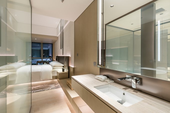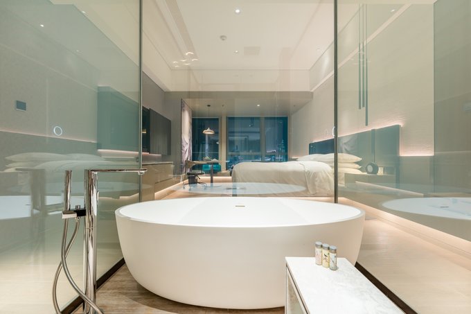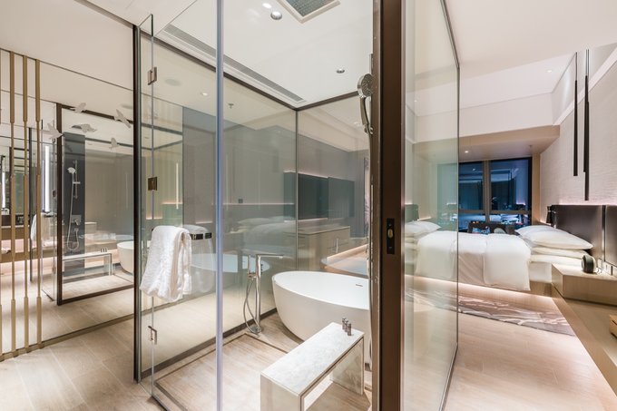 客房的设计上同样运用了“水、木、土、川”的元素,在不同的区域使用了相对应的装饰去点缀,让每间客房都充满了艺术气息,朴实典雅又富有内涵,让每一位入住的客人都能随之感受得到。当然,最令人印象深刻的莫过于房内的大浴缸,采用透明玻璃设计的浴室,从浴室中便能观看到窗外的风景线,如此独具一格的设计极富现代感。