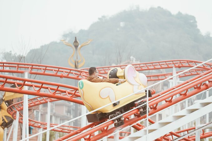 3.田园过山车 刺激指数:★★★★★ 田园过山车在彩虹滑道的对面,小动物造型的座舱萌趣可爱,轨道迂回曲折,上上下下,跌宕起伏,可以大人带着小朋友一起玩,也适合平日不敢玩成人版过山车又想体验那份刺激感的大人。