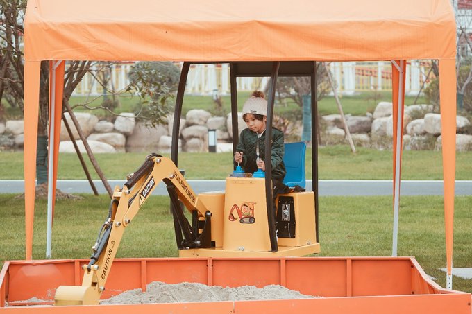 4.挖机能手 刺激指数:★ 挖机能手也在彩虹滑道旁边,好像大部分男孩都对挖掘机有一种与生俱来的爱,也包括元宝在内,公园里经常看到三五成群的男孩子拿着挖掘机在沙堆土丘上饶有兴致地挖来挖去,这源于男孩子天生就有一种征服欲,渴望拥有自己的地盘,建立自己的属地。