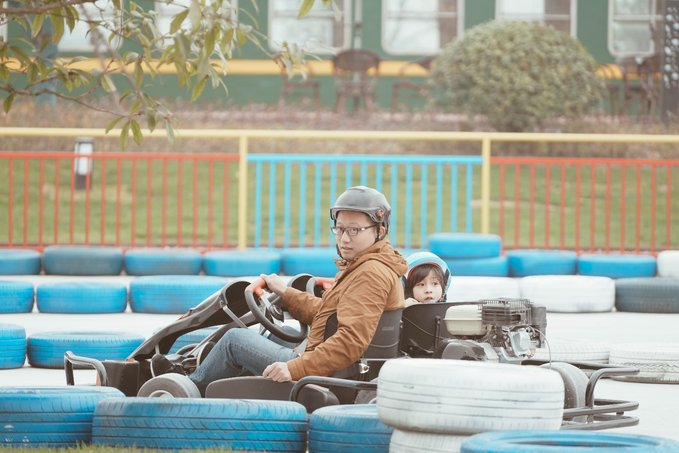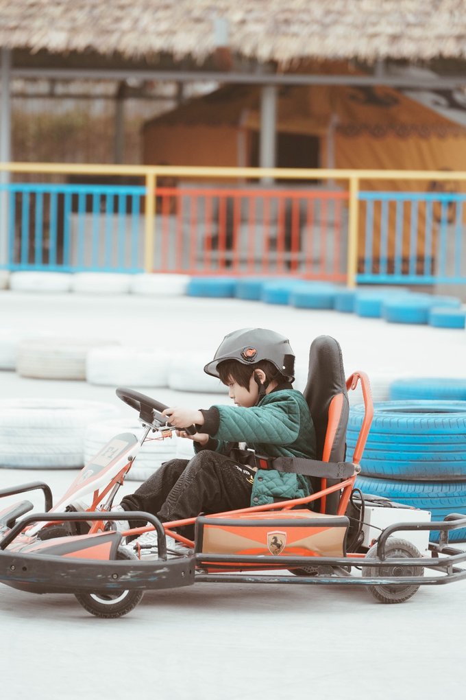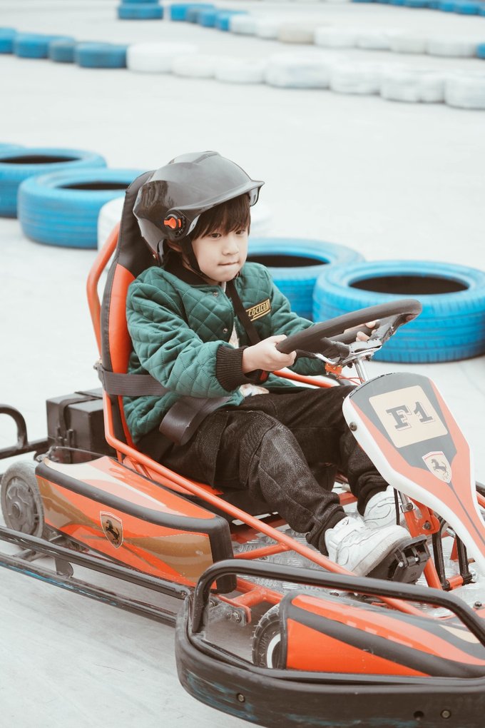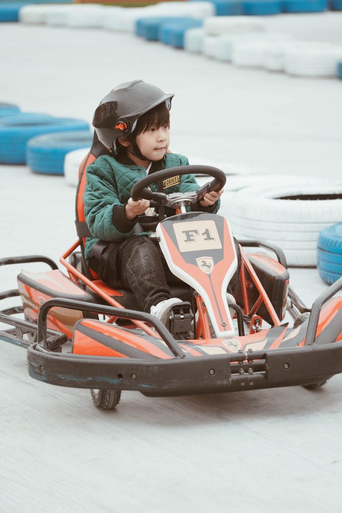 也有供儿童玩得单人电动版,元宝先是和爸爸玩了双人版,体验了一把速度和激情,然后自己驾驶了单人电动版,通过踩刹车控制方向盘等,很锻炼手脑协调能力,亲自感受了驾驶的乐趣。