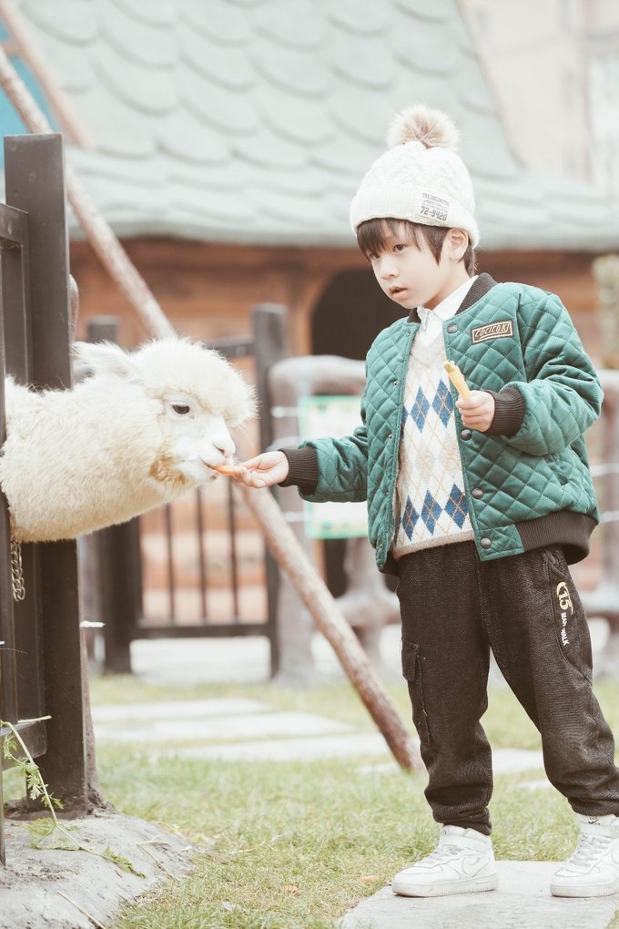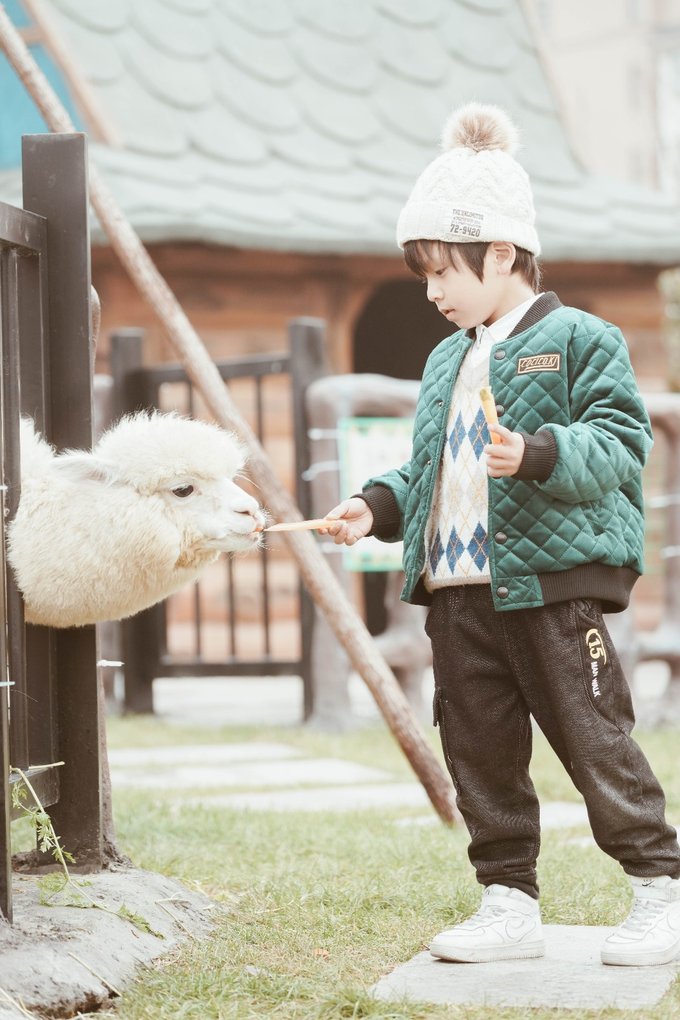 还可以喂羊驼和小兔子,元宝拿着胡萝卜喂羊驼喂的很起劲,和羊驼在一起的画面也超级温馨。