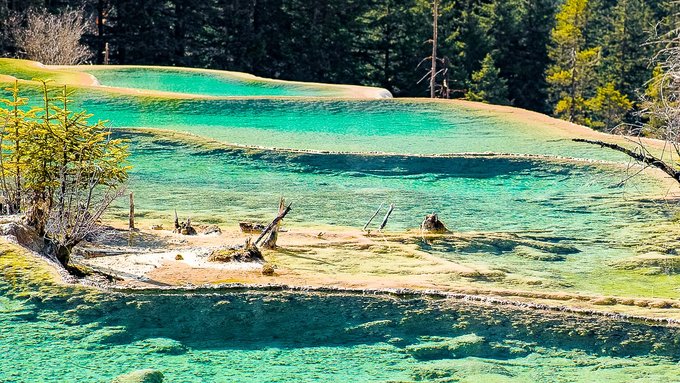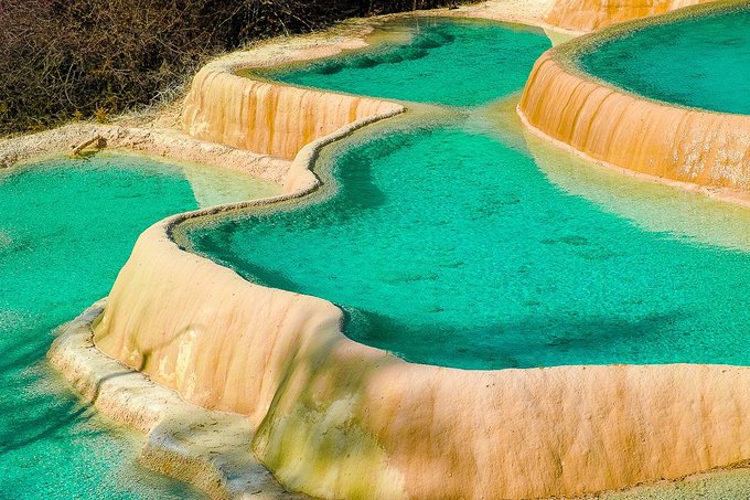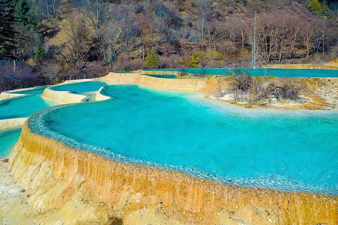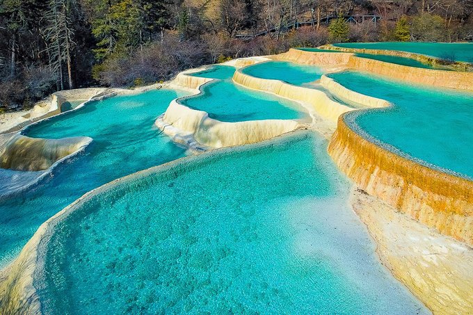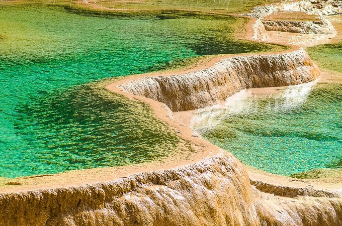 “莲台彩池”:它是景区钙化彩池最集中的区域,可以说是一池连着一池,大池套着小池。您站在上面往下看,那层层波光,是不是宛如颗颗宝石,正从高到低极致铺开?最下面是宁静而安详的青龙海,这般水景天成的绝世之美是无法用语言来形容和比拟的。