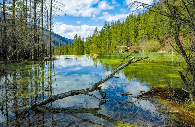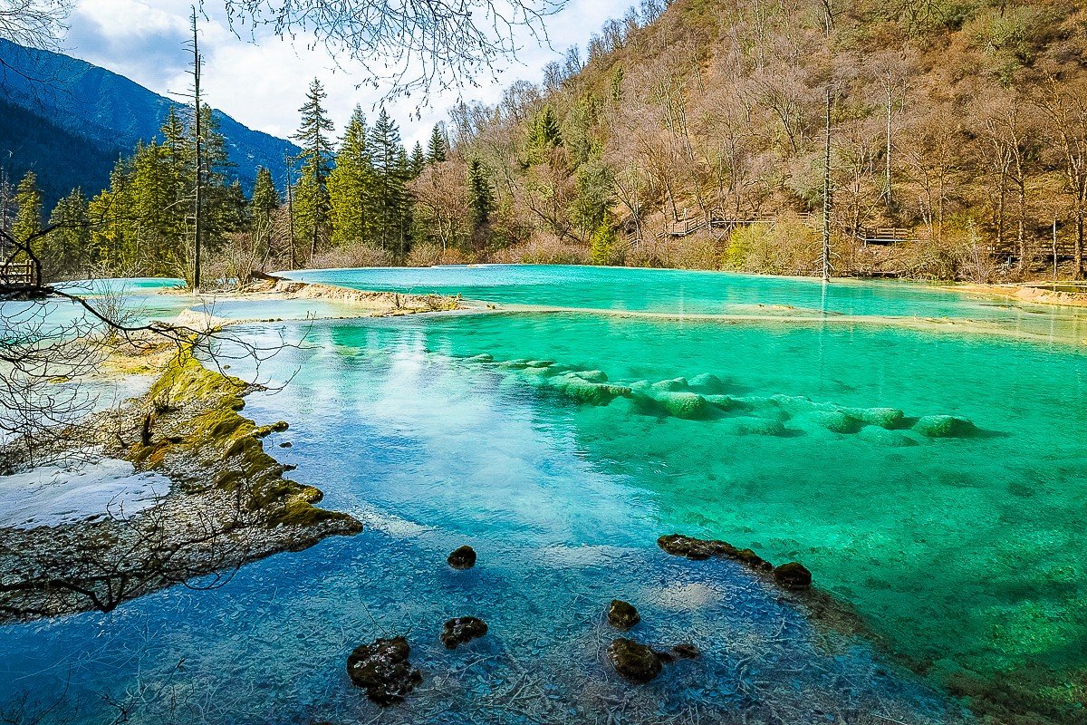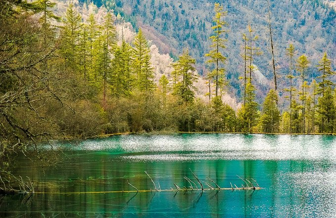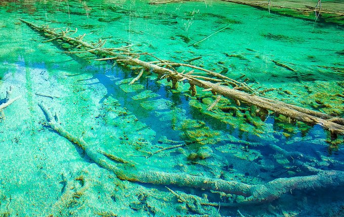 那凸凹不平的钙化塌陷,落入池中的交错树木,弯弯曲曲的藤蔓,舒卷飘逸的水草,大大小小的松球,在清澈澄碧的湖水里,宛如一件件精致的牙雕玉镂艺术品。