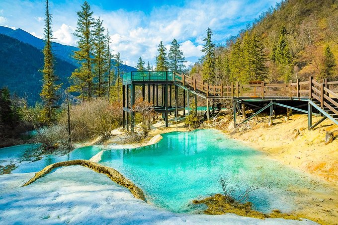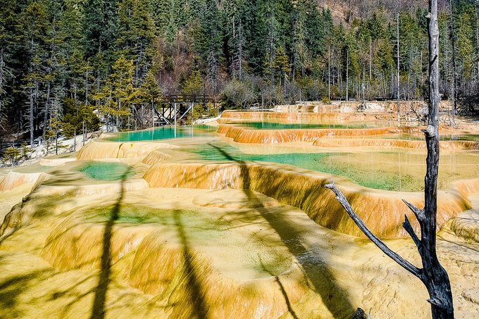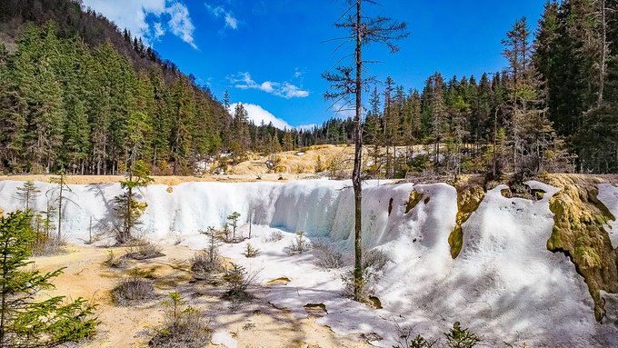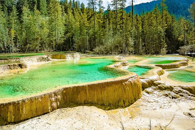 神仙池风景区,典型的地表喀斯特地貌,成片的山坡被黄色、乳白色钙质包裹,形成了2600个大小不等、水色明丽的水潭和高山湖泊,也就是当地人所说的“海子”和“钙化台地”。