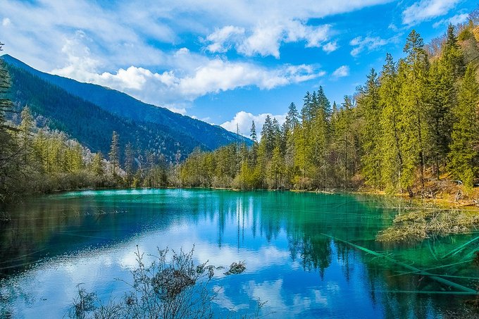 青龙海:它是景区的第二大海子。我们可以看到,四周的植被郁郁葱葱 ,是相对比较独立的一个景点。沿着环行栈道走上一圈,且不说湖光山色之美,就林间错落有致的吊麦杉、云杉、雪松及高山冷箭竹、杜鹃树、地苔 、海风藤等等,就是一道道美不胜收的风景。这里树根、树干沉淀的钙化池,有的像玛瑙,有的像珊瑚,有的如珍珠,质地纯洁,造型精巧,俨然一尊尊天然的艺术品。