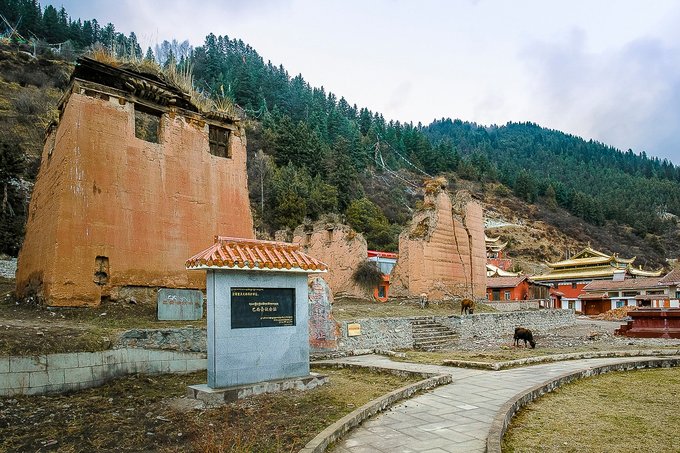 古藏寨里的大录寺,全名彭措罗尔伍林寺,意为大录圆满珍宝洲,也称顶果寺,由康巴地区高僧曲扎让波始建于藏历第八绕迥火鸡年是公元1477年,距今 543年,为藏传佛教吉祥萨迦派,若尔盖求吉寺子寺。