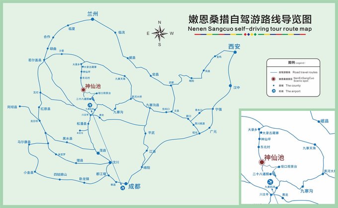 第一条:若尔盖——巴西会议遗址——巴西镇——求吉乡——翻越喇嘛岭(海拔3990垭口)——大录古藏寨——神仙坪——神仙池,全程143公里。 第二条:川主寺至九寨沟之间的上寺寨入口——拉莱河坝——最美网红公路28道拐——日月观景台——亚龙那日神山(意为不留泪的神山,海拔3688米垭口)——神仙池,全程45公里。 第三条:九寨沟县城——黑河大桥——沿途景点有黑河大峡谷、喇嘛石、悬泉——九寨天珠——大录古藏寨——神仙坪自驾车营——神仙池,全程128公里。
