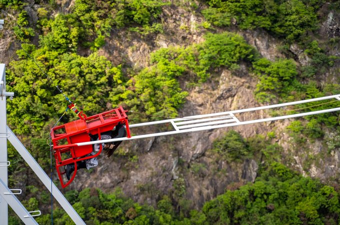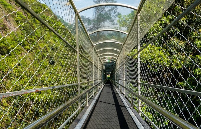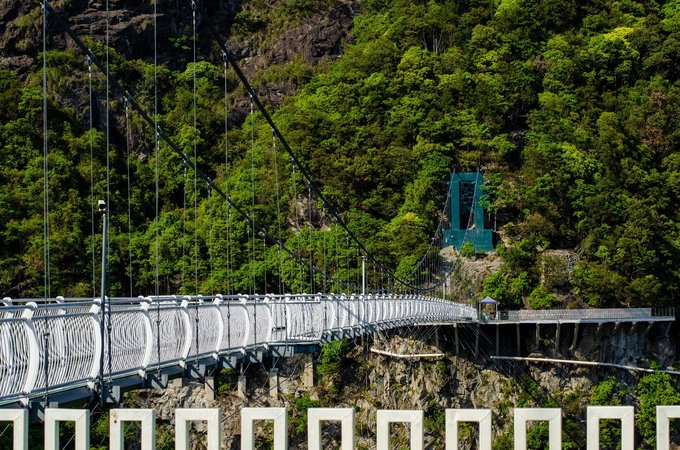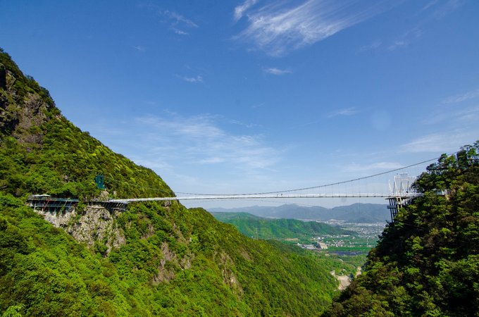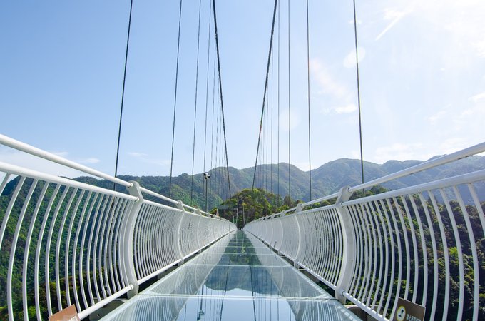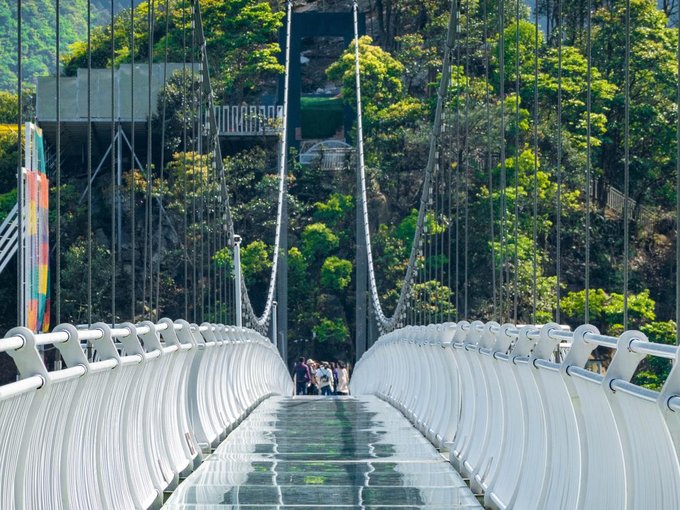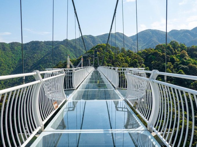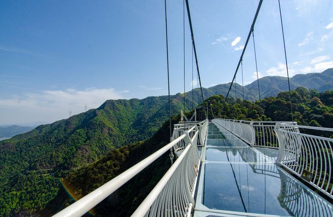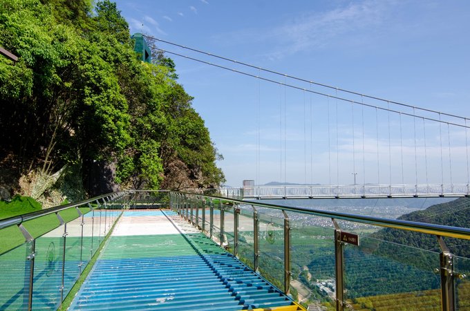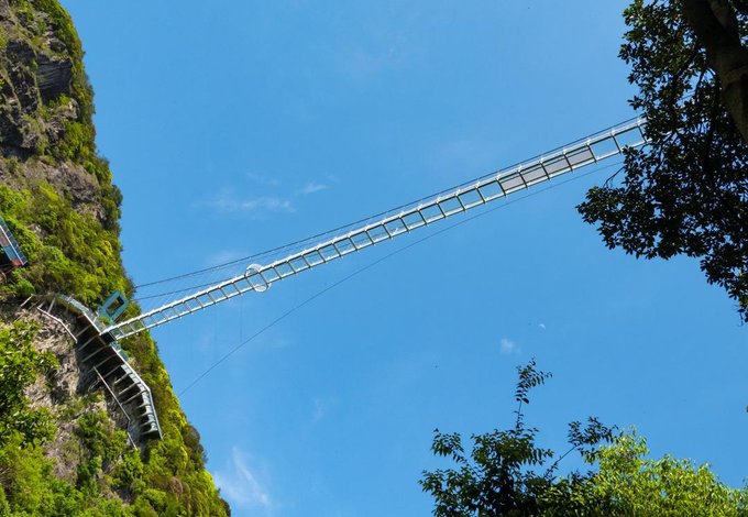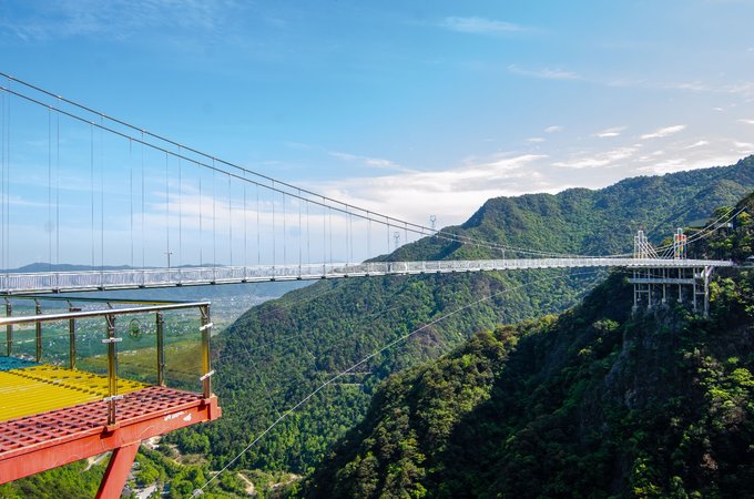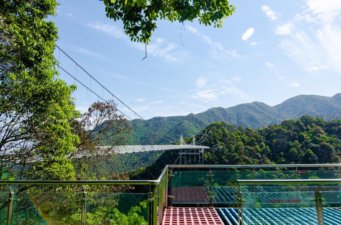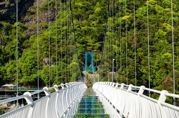 桥全长达200米左右,悬空的桥身150米,离地高度超200米,是由铁索和多块巨大透明玻璃搭建而成。风和日丽之时踏在玻璃桥上,梁皇山谷的美景尽收眼底。不过对于恐高的朋友来说,从60多层楼高向下俯视真的是一个大大的考验。但是游客们大可放心,这里的安全系数很高,如果你不想错过这美景,一定要来这走一走。