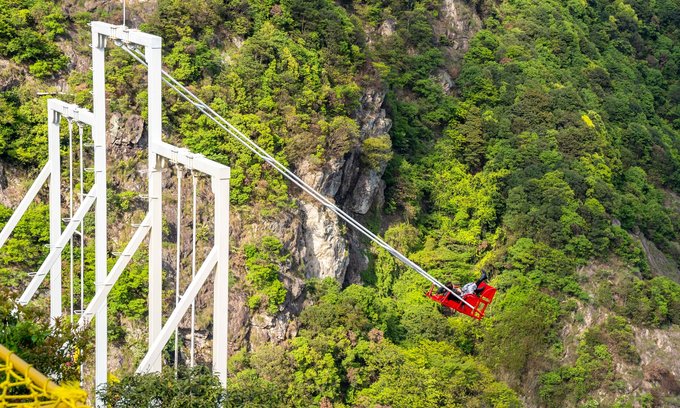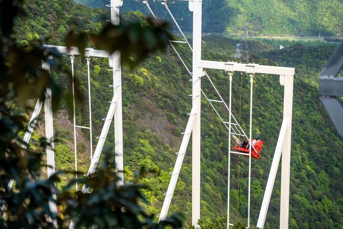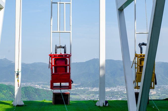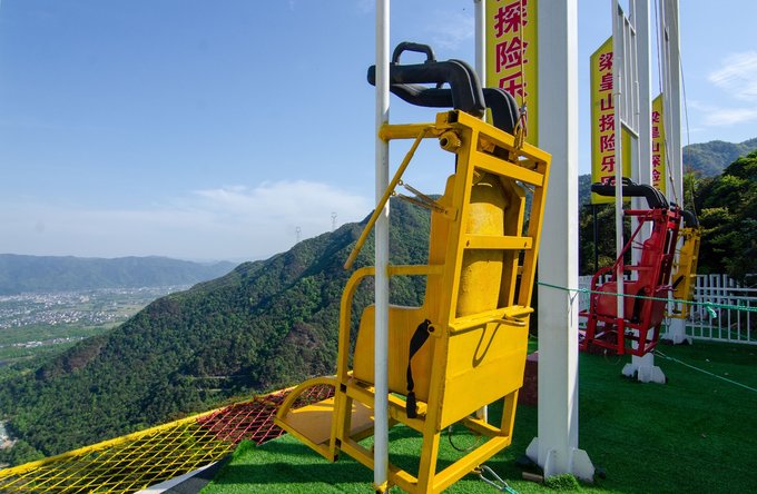 在同伴们的鼓励下,壮起胆子上去挑战一下胆量。系好安全带,座椅在磁铁的吸引下慢慢上升,到最高点时距离地面已经有三四层楼的高度。最刺激的是磁铁刚刚松开的一刻,在重力加速度的作用下仿佛被砸向地面,又被绳索牵引抛向空中,顿感血脉喷张,但是也就在那被抛向最高点的那一刻,一声呐喊,回荡在山谷之间,确实很爽。