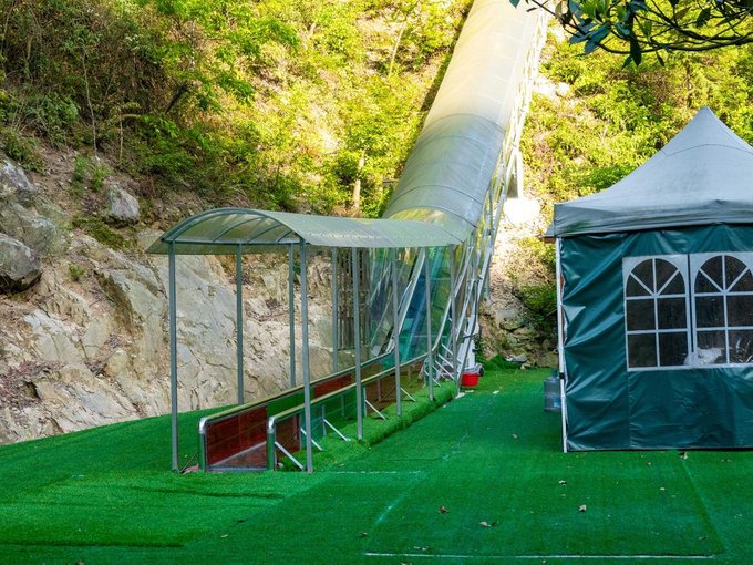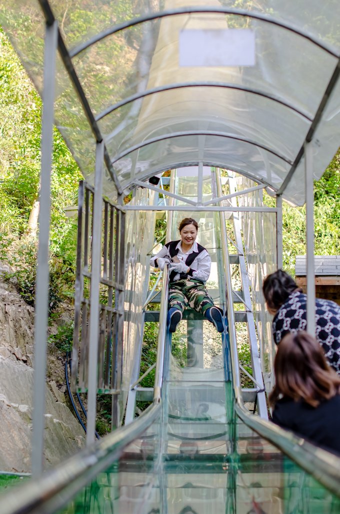 不知不觉这次来梁皇山的短暂旅行也快接近尾声了,体验完刺激的探险乐园,我们也便不舍下山了。这时候你可以选择走路下山,或者体验长约200米的玻璃滑道,像我这样具有冒险精神的,肯定会选择再刺激一番。