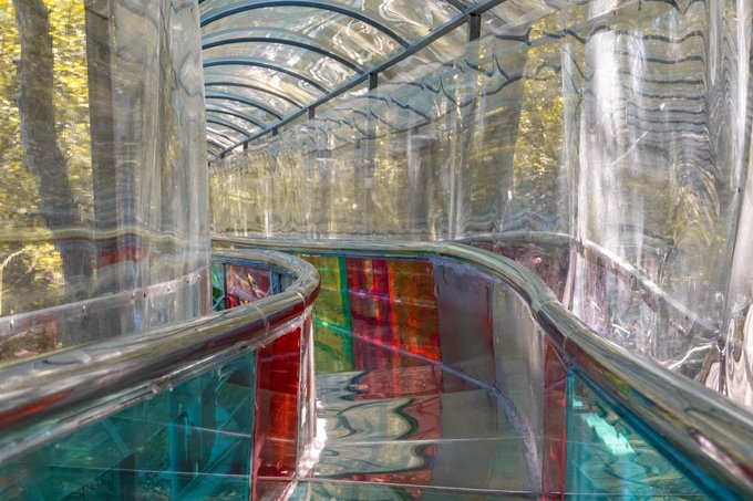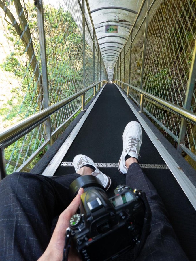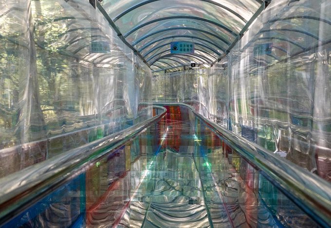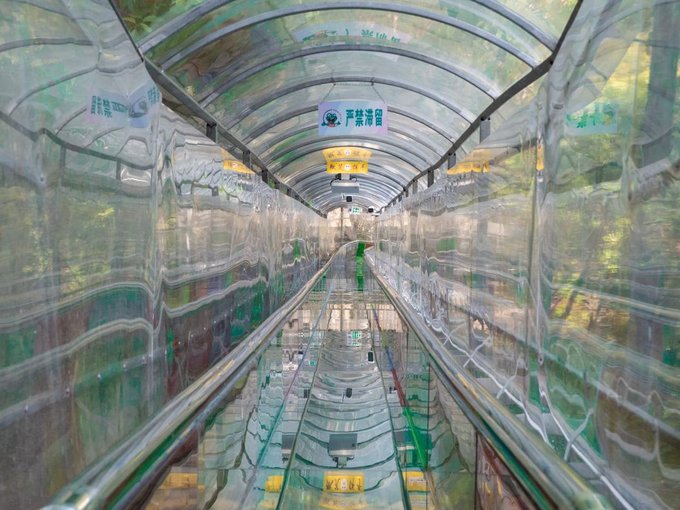 到达玻璃滑道入口,工作人员会让你排队一个个下去,这时候滑下去那叫一个心旷神怡啊。虽然他的速度没有很快,但还是要友情提示一下:滑下去时候注意用双脚卡住两边,控制速度,别撞到前面的游客,在拐弯处很滑更需要注意把控。