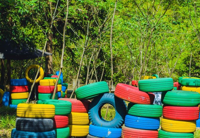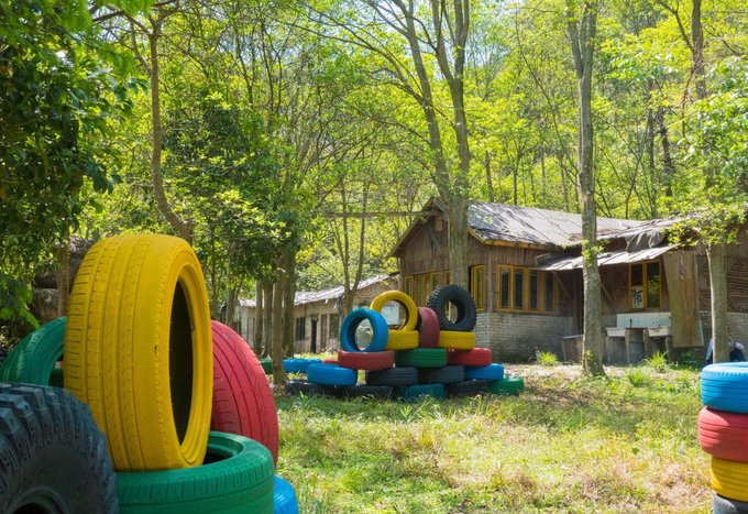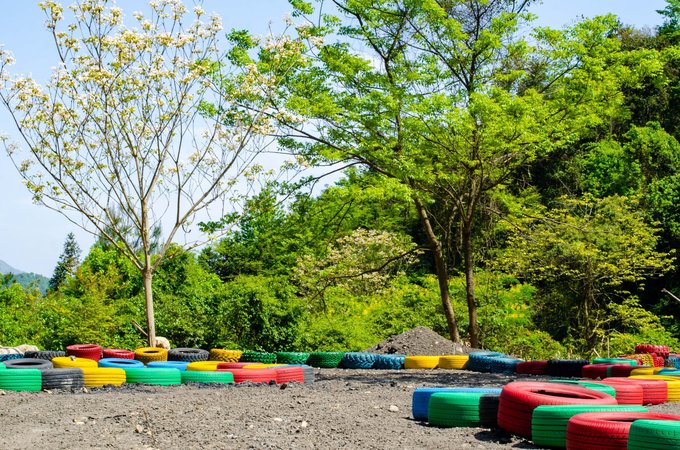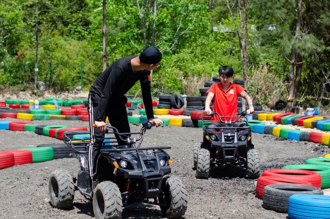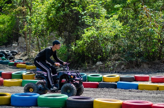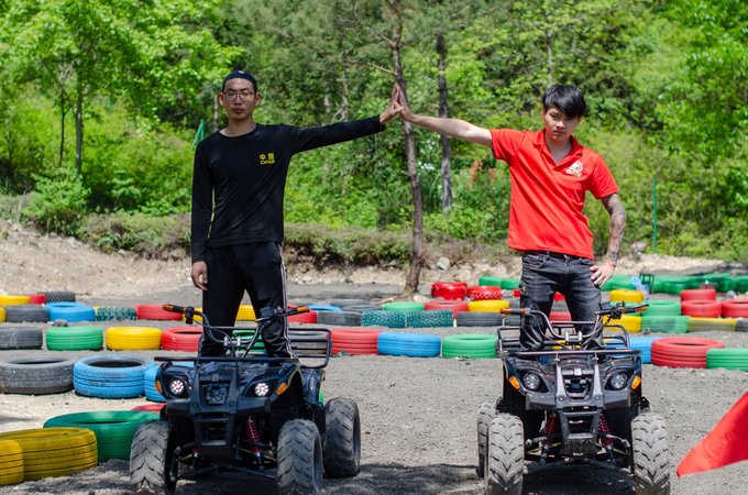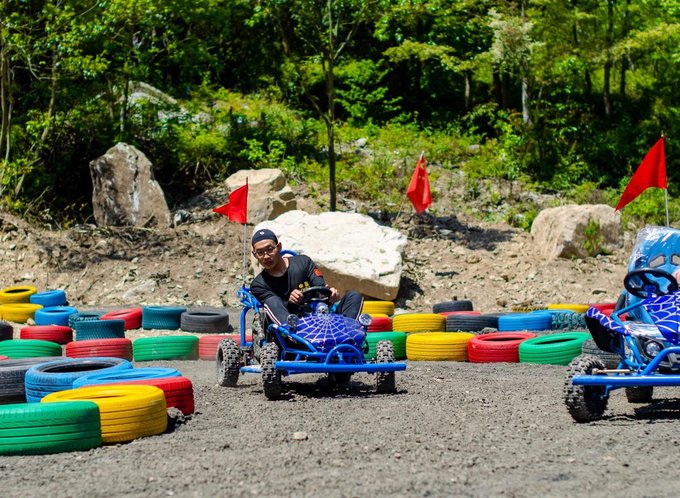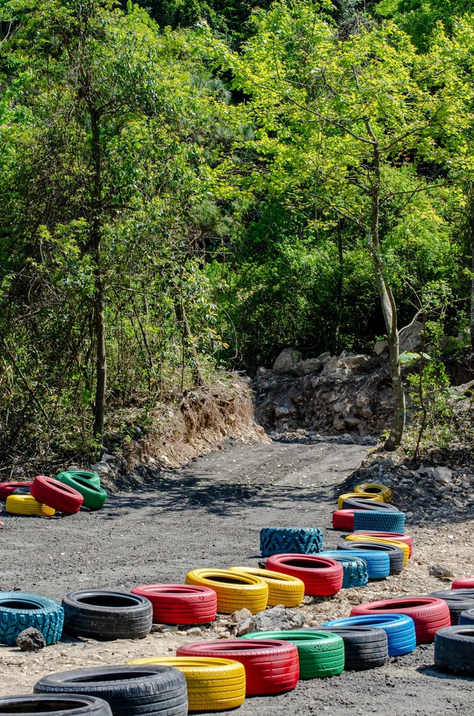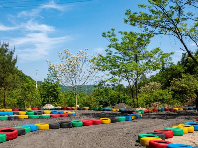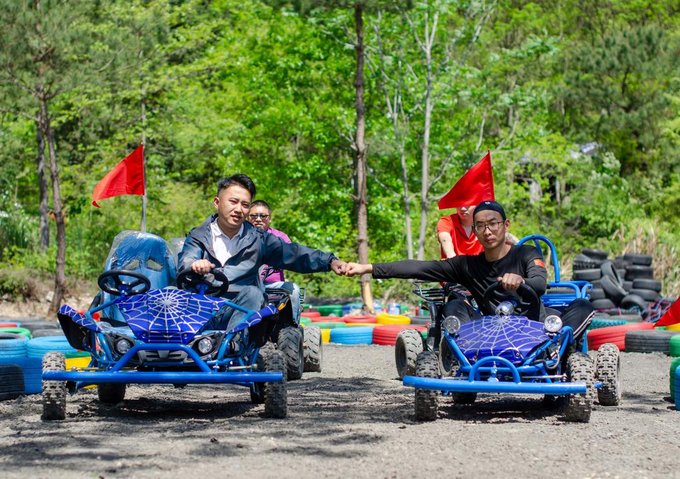 近百来个画上涂鸦色彩的大型轮胎环绕着葱葱郁郁的树摆出多个S型,坐上工作人员为你追备好的卡丁车,你便可以开始驰骋赛场了,每到一个卡口你甚至还能闻到淡淡的花香。还别说,第一次玩卡丁车的人会有一点找不着方向,石子路会让你有一定的阻力,但是多试几次以后便能游刃有余。