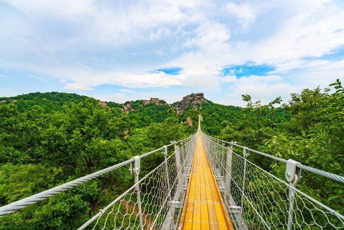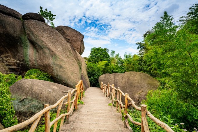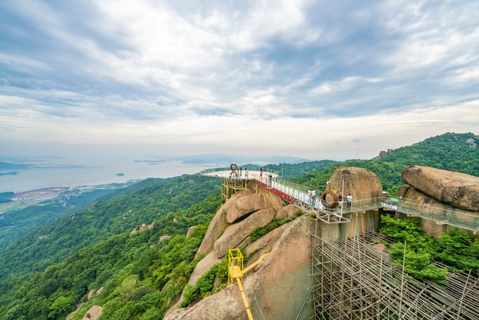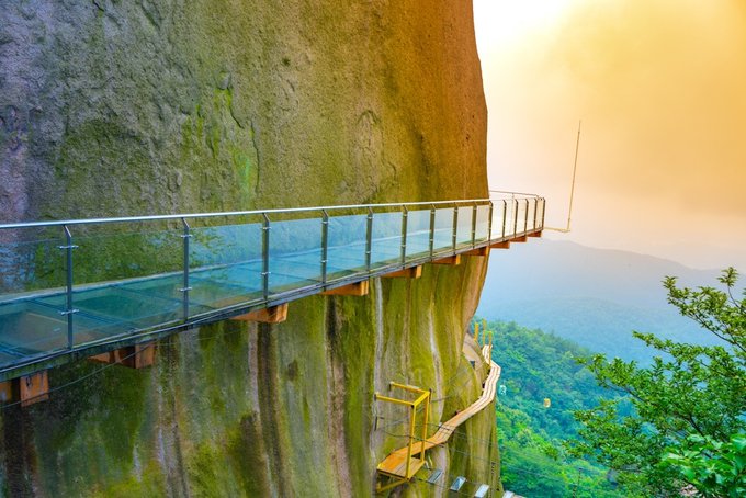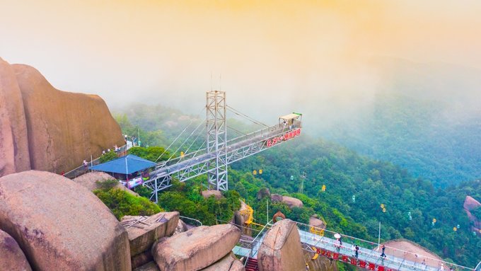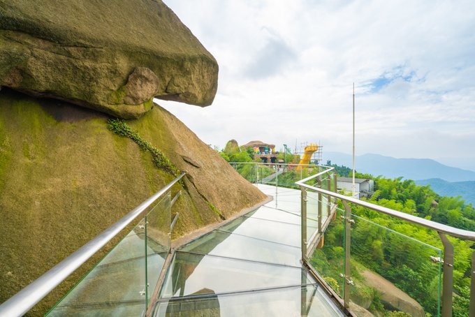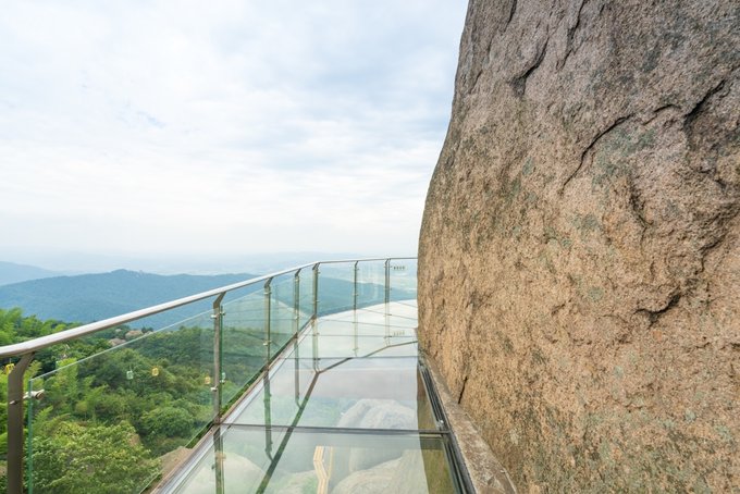巨石山的玻璃栈道也是很有特色,玻璃栈道镶嵌在悬崖一次,一边是高耸的悬崖,而另一侧便是深渊,低头看脚底便是悬空,走在上边惊险刺激。