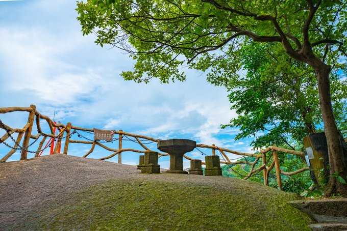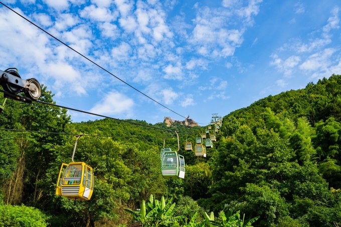 第二日清晨,走出房间放眼望去,比起昨天的烟云缭绕,今天的巨石山在蓝天白云下显得格外清晰,简单吃过早餐决定登上山顶一睹巨石山的神秘容颜,巨石山的索道是直通山顶,所以即便是不太热爱爬山的人也能轻松感受山顶的美景,十几分钟的索道便到达山顶索道站,在往上走个五六分钟便能到达巨石山的山顶,也便是悬崖乐园的主场地。