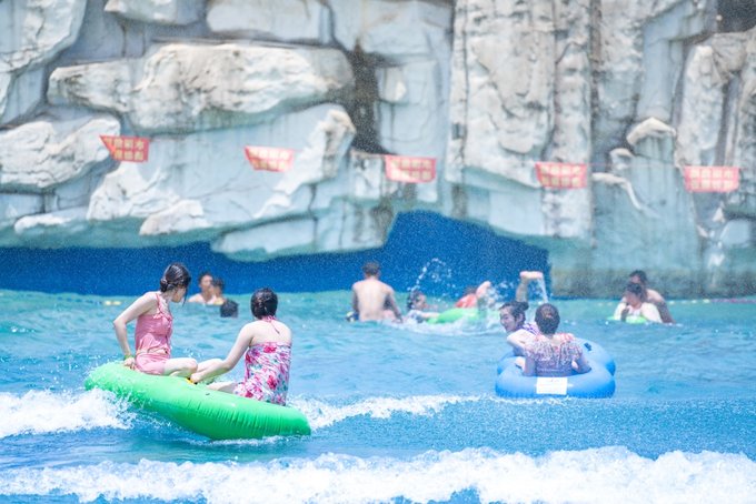 在往里走是一处造浪池,总面积12000平方米,可提供8种造浪模式,最高浪潮可达3米,在这里可以感受大海中激情澎湃地冲浪,客享受到魔幻的、浪漫的亲身体验。