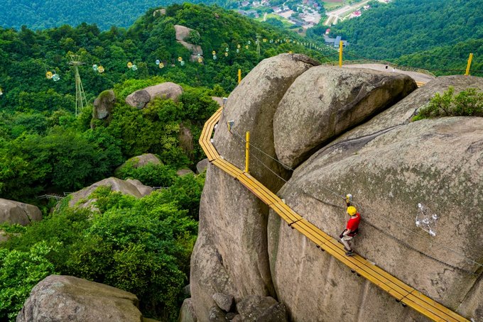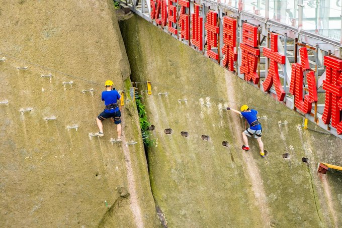 玻璃栈道的下方便是石林穿越,比起玻璃栈道这条路绝对更让你心惊胆战,一条窄窄的木板便是路,保险带几乎需要步步移动才能前行,最窄的地方只能承载一只脚,在临近终点处最刺激的地方需要把脚放进凿出的山洞中,正在身体立于悬崖之上。