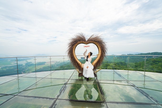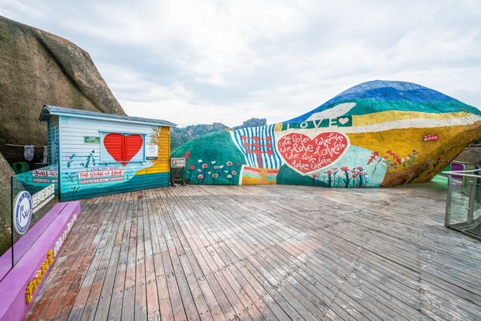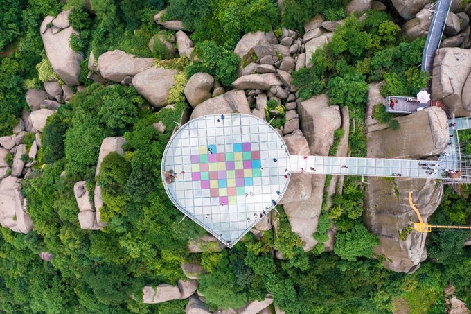 在玻璃栈道的尽头便是巨石山的网红打卡地——心形玻璃观景平台,这是世界吉尼斯世界纪录的保持者,最大的心形玻璃观景平台,并且这座观景平台有一组非常浪漫的数字,海拔高度520米,长度520米,面积529米,视角520度,因此这里也成为了浪漫爱情的打卡地。