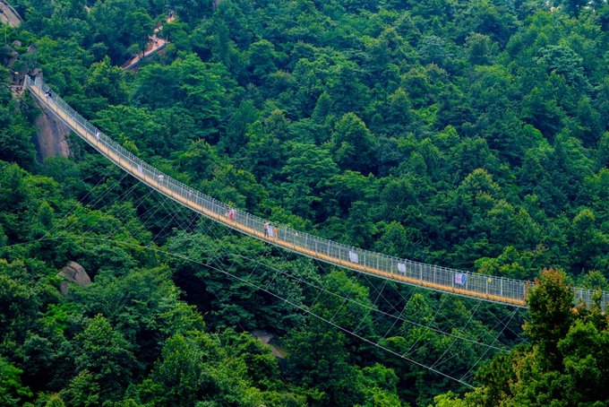 过江龙吊桥桥长365米,距地面最大高度52米,吊桥的一端连接“海拔520米龙头峰”,是“龙头晓日眺望长江”的最佳景点;桥底是碧莲池,在水面的倒映下,天空是天空,湖面也是“天空”。