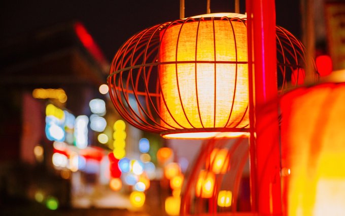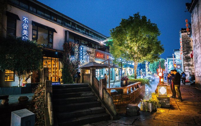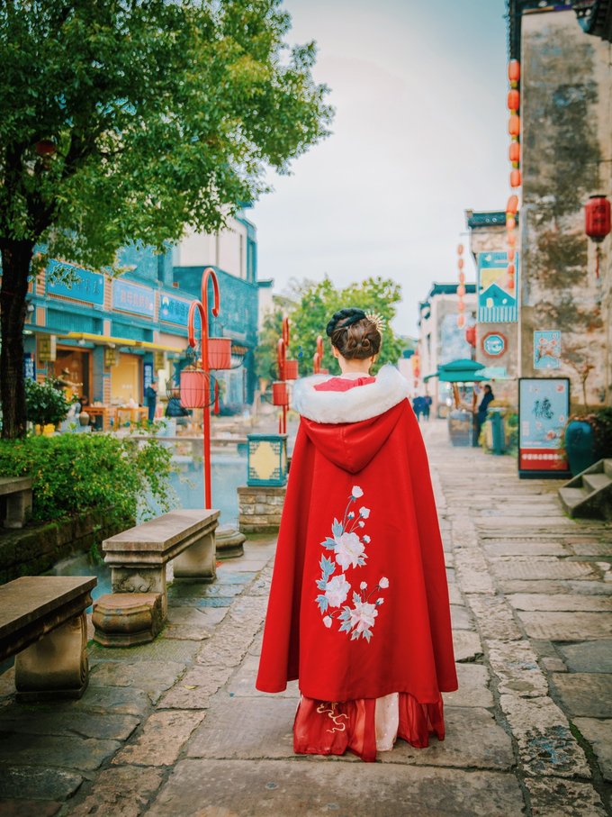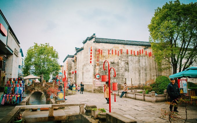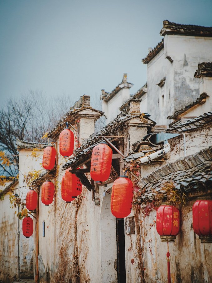红色的灯笼,荡着波光的小河,有质感的石板路,和热闹的人群,古老的徽派建筑在灯光的衬托下,显得韵味深长,一排排红灯笼和廊棚、屋檐倒映在老街里,时光浅浅,温馨又静谧。
