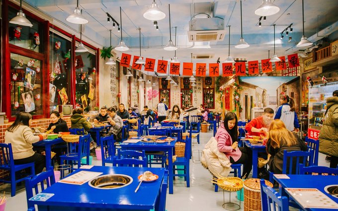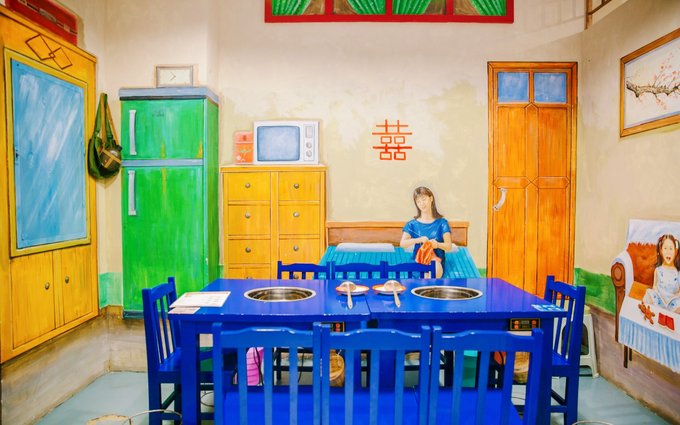 --美食打卡-- 黎阳In巷里风景美,美食更美! 老巷子里新开了一家人气串串店马路边边,就是我们此行的美食目标; 复古怀旧的氛围,各种精致地道的小吃,正宗四川锅底+各种种类丰富的串串,来到这里,每面墙绘都充满年代感,加上周边超接地气的搪瓷杯,小卖部,拍照吃串,瞬间就能让人穿越回熟悉的那些80年代!