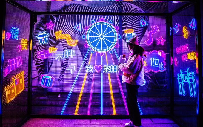 散落在黎阳In巷里的各种网红打卡拍照点也在一夜之间同频绽放,吸引着来往的游人徜徉街区流连自拍,用移步异景的街角风景表达心中的万千情感。