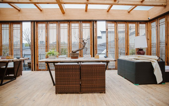 无论早晚,也都可以登上顶层的阳台,这里是徽自在赏景最妙的场所,将水墨村居、层峦山峰一览无遗。