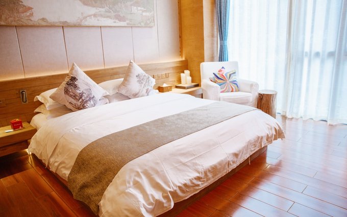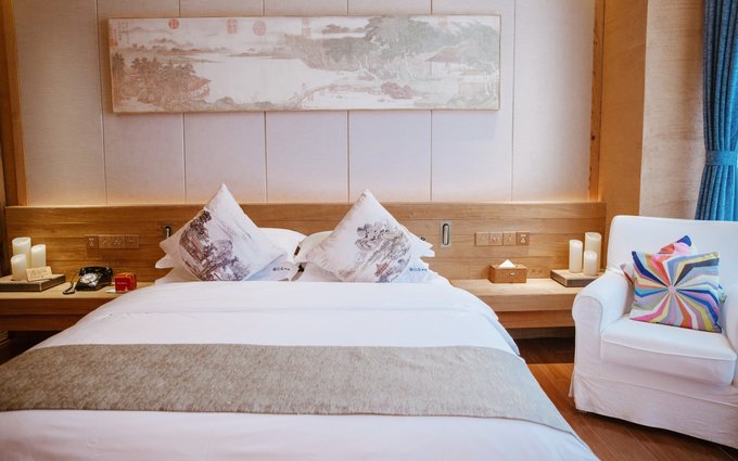 16间客房在这里平静地隐匿,明黄色的淡暖基调,恰好适宜的大小空间格外清雅,床头墙上挂着一幅素雅的水墨画,文艺气息扑面而来,白纱做窗帘,透光不透明,沙发椅的色彩和抱枕以及遮光窗帘,整个装饰颇具格调,原木的素色、清晰的纹理、随意的形态,无不勾勒出自然的气韵与情致。 或是凭栏倚窗,或是品茗茶香,或是风月浪漫,或是吟诗作词,一盏清幽里,徜徉在诗风词韵的古典中,可以自由地慵懒与安眠。