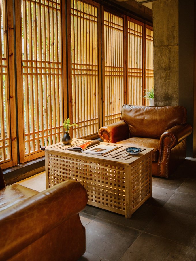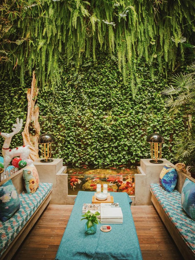 电梯后面的绿植墙是整座客栈人最多的地方,满幕的绿植郁郁葱葱,极其雅致,沙发旁穿梭其中的金鱼为整个空间注入了生机与活力,在这里你总能感受到闹中取静的悠闲,妥帖地抚慰游客们疲惫乏力的心。