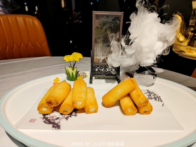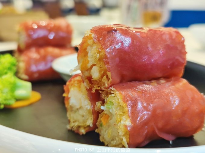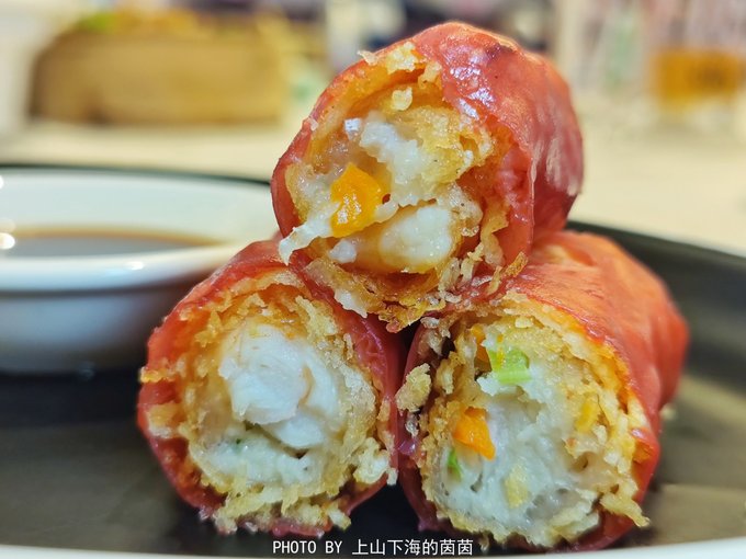 红米藏珍肠:柔韧有嚼劲的红米肠粉皮裹着被炸得酥脆的虾肉,虽然不是传统意义的肠粉,但外表绵密、中间酥脆、内里鲜嫩的三重口感,真的好吃!