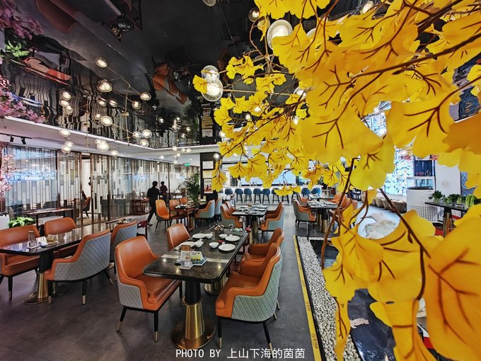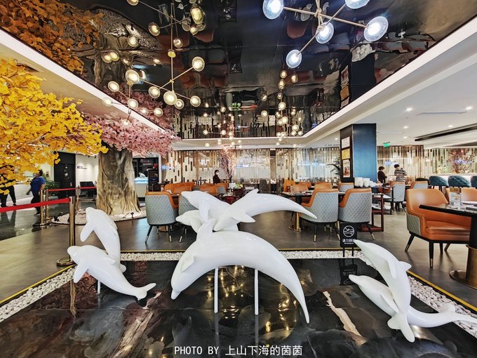 店内的装修走得是精致时尚风,跳跃的海豚、浪漫的樱花、金灿灿的秋叶……大排落地窗带来合理的采光和错落有致的空间布局。