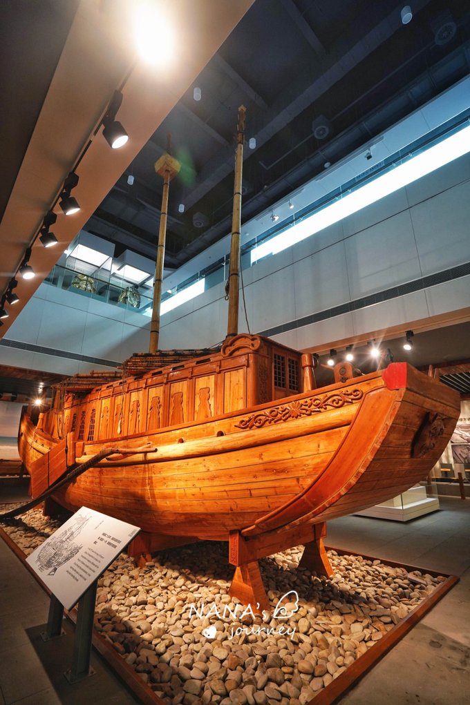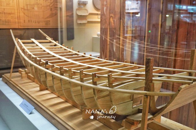 另一个展厅还有一艘大木船,是明代的快船。以1:2比例复原。这艘木船,两侧都安装有披水板,我们从解剖的一次看到内部细节,大家更快了解船只制造工艺。