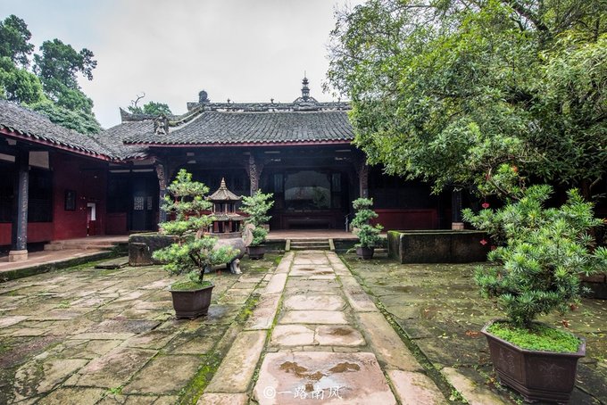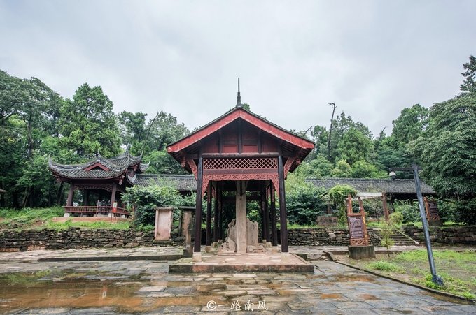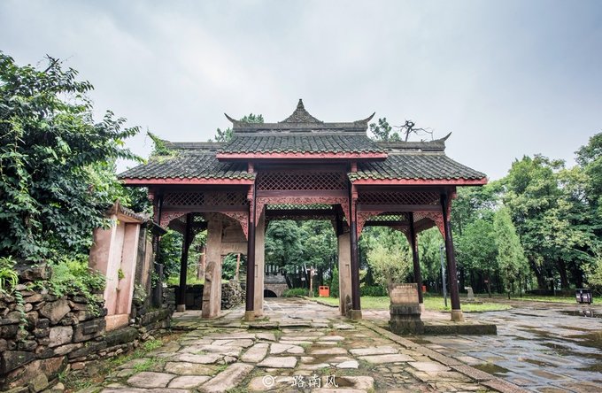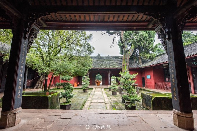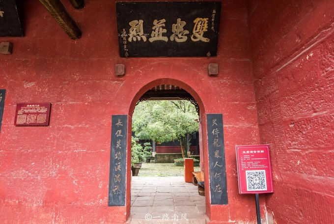 穿过城门就看到金牛古道,右侧是庞统祠墓,这片朱红色的庭院式古典建筑群气势恢宏,斑驳的外墙张扬着历史感。 庞统祠内游人稀少,安静的氛围更添庄严肃穆。 庞统和诸葛亮都是刘备的军师中郎将,庞统有“凤雏”的外号,“卧龙”则是诸葛亮的别称。