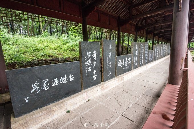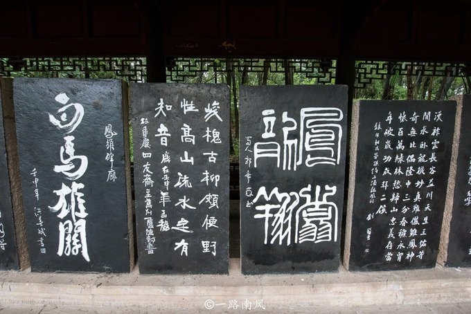金牛古道另一侧,庞统祠前广场的斜对面有一条古朴典雅的碑廊,展示不同朝代,不同名士留下的石碑书法作品。