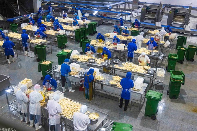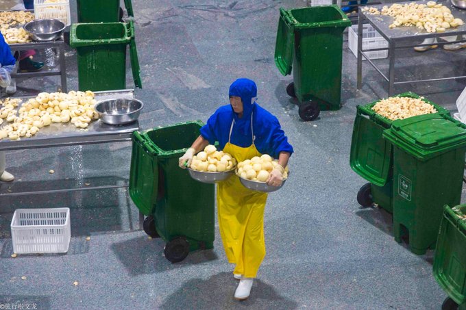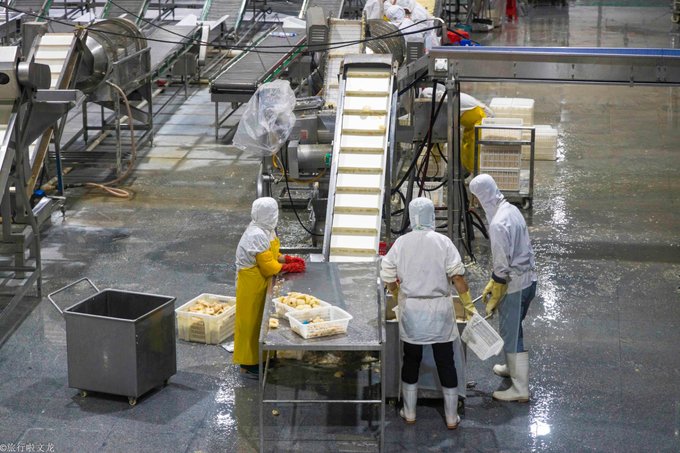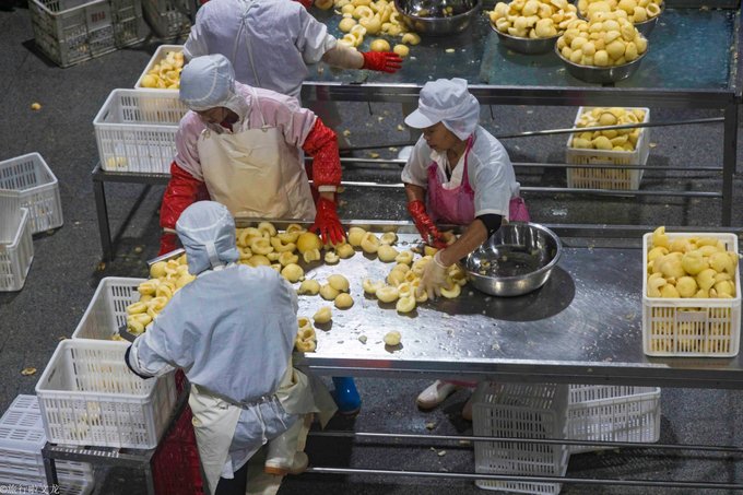 我们看到车间正在加工着梨,工人们穿着工作服,戴着手套,认真的进行工作。