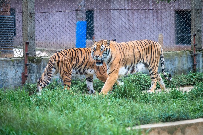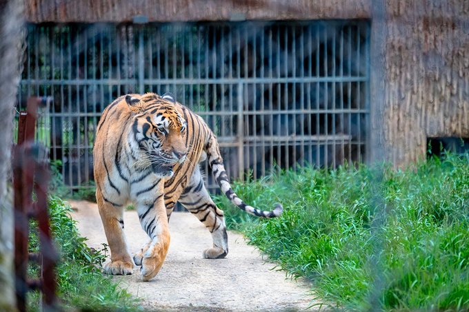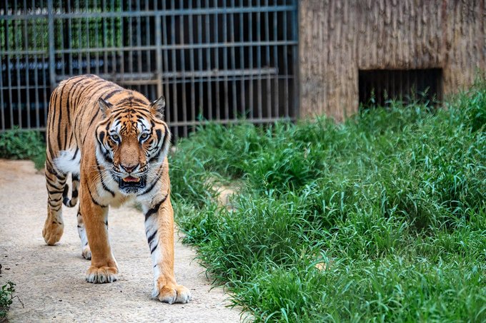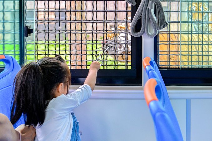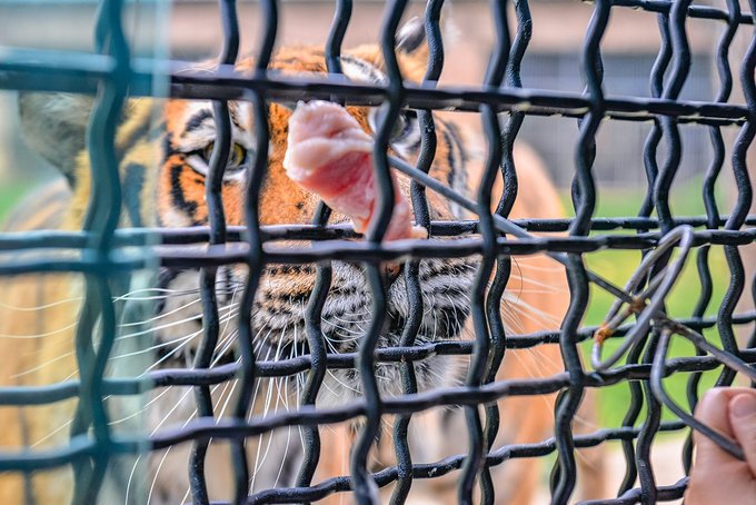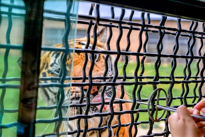 工作人员把喂猛兽的鲜肉串到做了防护的铁签上,她从窗户网缝塞出去,喂到老虎嘴里,一点都不怵。从防护网上看出去,没吃到的大老虎有时侯还会过来抢食,有点凶悍又意外的萌。
