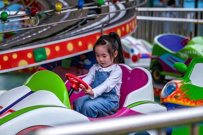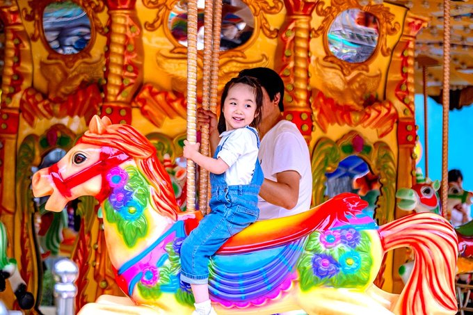 小姑娘最喜欢的是旋转木马,一趟坐完还想坐下一趟。