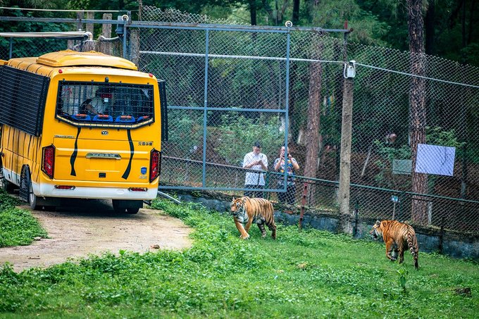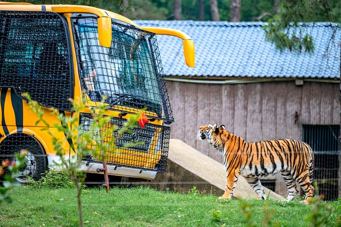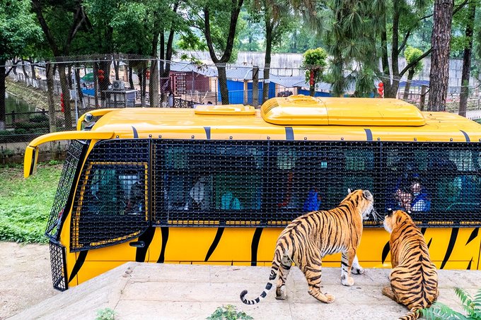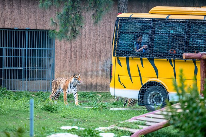 猛兽体验区全程不过几公里,但整个游线过程中为了观赏体验,车速开得很慢,在经过平台区域时还会停下来,给出喂虎观虎的时间,所以转完整个区域的时间却也不短。