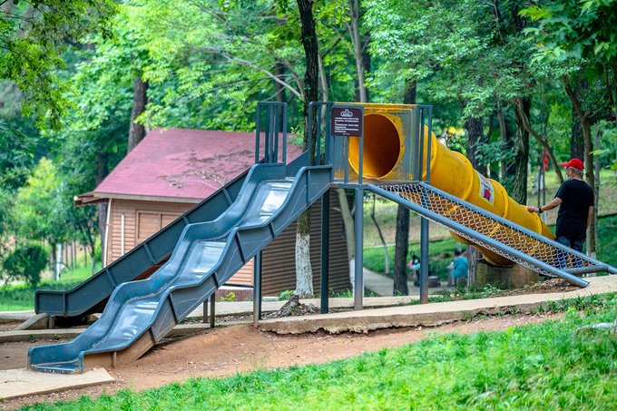 再往上走,道路两边都是密林。林中间或设立了像滑梯、攀爬架之类的儿童游乐设施。