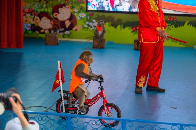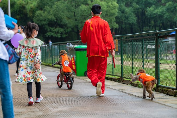 猴园旁边有两个表演场地,一个是森林剧场,这里从上午10点到下午4点,平均一小时有猴戏行为艺术。小猴子们会骑车,会采高跷,会算数,会拉琴,机灵可爱。