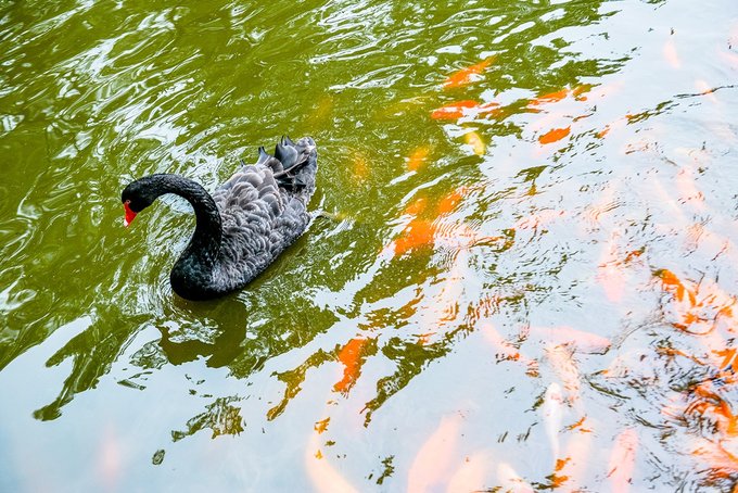 园区中间还有个小湖,湖面上栈桥曲折,湖面有黑天鹅,湖里还有锦鲤,鱼食撒下去,成群接队扑腾扑腾直抢食。